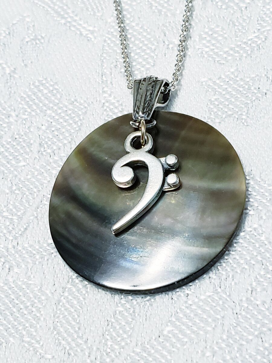 Unique Bass Clef necklace has a Sterling silver bass clef dangling in front of a 1.5" abalone disk that has green and gray colors that pick up purple, blue and lavender hues in the light. The back is a plain pearl color.