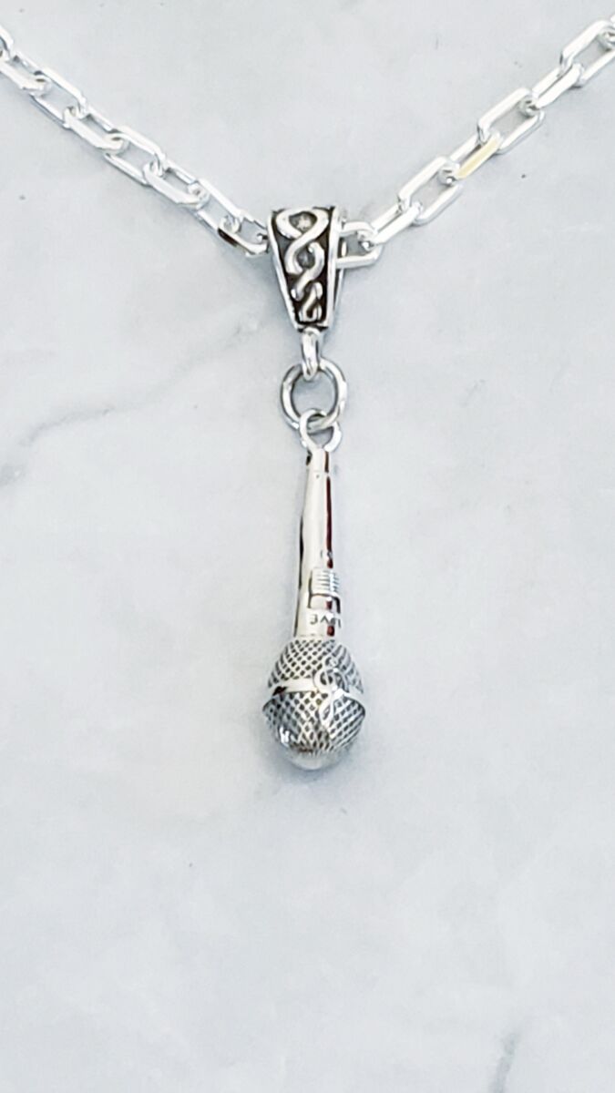 Mens Microphone necklace is a classic medium sized microphone pendant of solid sterling silver with great 3D detail of a Shure SM58 microphone. Comes on 20" 4mm thick Sterling Italian chain.